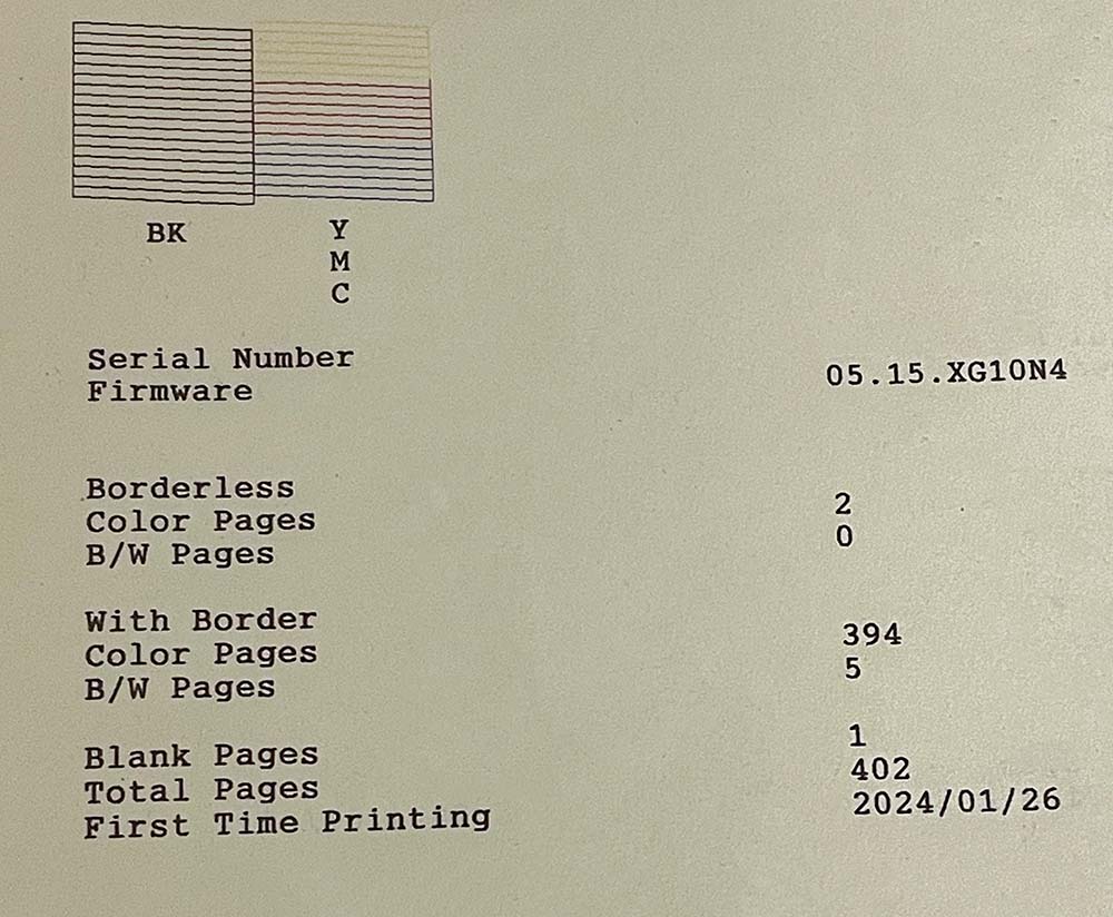 So sieht ein korrekter Düsentest aus, inklusive Anzeige der gedruckten Seiten bei Sublimationsdruckern ohne Display